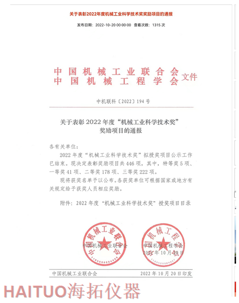 海拓儀器榮獲2022年度中國機(jī)械工業(yè)科學(xué)技術(shù)獎?ICC訊?10月20日,2022年度“中國機(jī)械工業(yè)科學(xué)技術(shù)獎”項目名錄正式發(fā)布,由海拓儀器(江蘇)有限公司完成的“超快速冷熱沖擊試驗系統(tǒng)關(guān)鍵技術(shù)研究與系列應(yīng)用”項目榮獲2022年度“中國機(jī)械工業(yè)科學(xué)技術(shù)獎”三等獎。??據(jù)了解,中國機(jī)械工業(yè)科學(xué)技術(shù)獎是根據(jù)《國家科學(xué)技術(shù)獎勵條例》和《社會力量設(shè)立科學(xué)技術(shù)獎管理辦法》的有關(guān)規(guī)定,由中國機(jī)械工業(yè)聯(lián)合會和中國機(jī)械工程學(xué)會共同設(shè)立并經(jīng)國家科學(xué)技術(shù)部批準(zhǔn),在國家科技獎勵主管部門登記的面向全國機(jī)械行業(yè)的綜合性科技獎項。旨在表彰在機(jī)械工業(yè)科技工作中作出突出貢獻(xiàn)的單位和人員,獎勵范圍包括:機(jī)械工業(yè)科學(xué)技術(shù)發(fā)明成果、機(jī)械工業(yè)科學(xué)技術(shù)進(jìn)步成果、機(jī)械工業(yè)工程化和新技術(shù)推廣成果和機(jī)械工業(yè)軟科學(xué)和標(biāo)準(zhǔn)成果。??海拓儀器是一家集研發(fā)、制造、貿(mào)易于一體高科技現(xiàn)代化公司,公司成立于2005年,主要產(chǎn)品包括:超快速冷熱沖擊試驗機(jī)(熱流儀)、快速溫變應(yīng)力篩選試驗箱(ESS), -